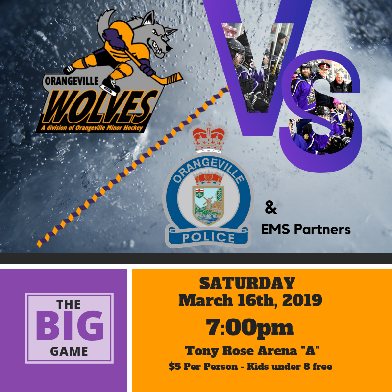 Come on out to Tony Rose Area on Saturday night for the Big Game between the Orangeville Wolves hockey team and the Orangeville Police Service. The game starts at 7:00 pm tickets are $5.00 and are available at the door. For more information about the event go the event page on Facebook.