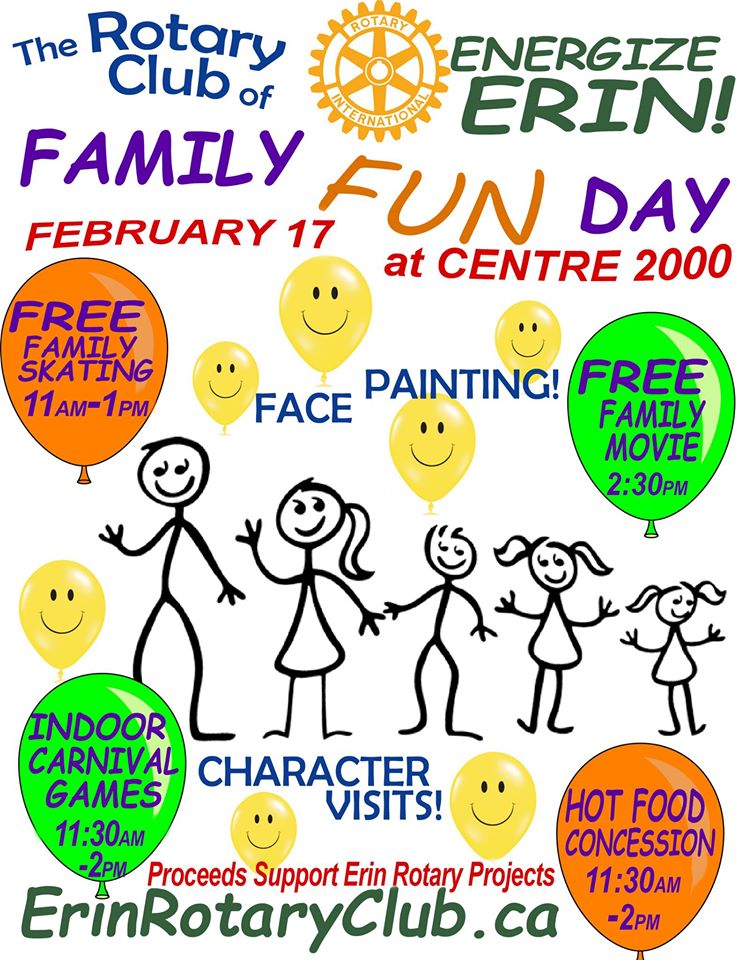 Monday the Rotary Club of Erin will be hosting a Family Fun Day at Centre 2000 in Erin from 11:00 am – 5:00 pm. There will be family staking, face painting, carnival games and free family movie. Go to the Facebook event page for more details.