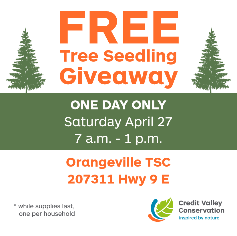 Saturday morning the Credit Valley Conservation Authority will be holding a Free Tree Seedling Giveaway at the TSC store on Highway 9 from 7:00 am – 1:00 pm. You can get one free tree seedling per household to plant on your own property. Go to cvc.ca for more details about the giveaway.