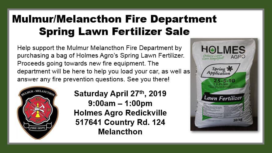 Help support the Mulmur Melancthon Fire Department by purchasing a bag of Holmes Agro’s Spring Lawn Fertilizer (20kg bag) at Holmes Ago Reddickville Plant on Saturday from 9:00 am – 1:00 pm. Proceeds going towards new fire equipment. Members of the fire department will be there to help you load your car, as well as answer any fire prevention questions. Go to the Facebook event page for more details.