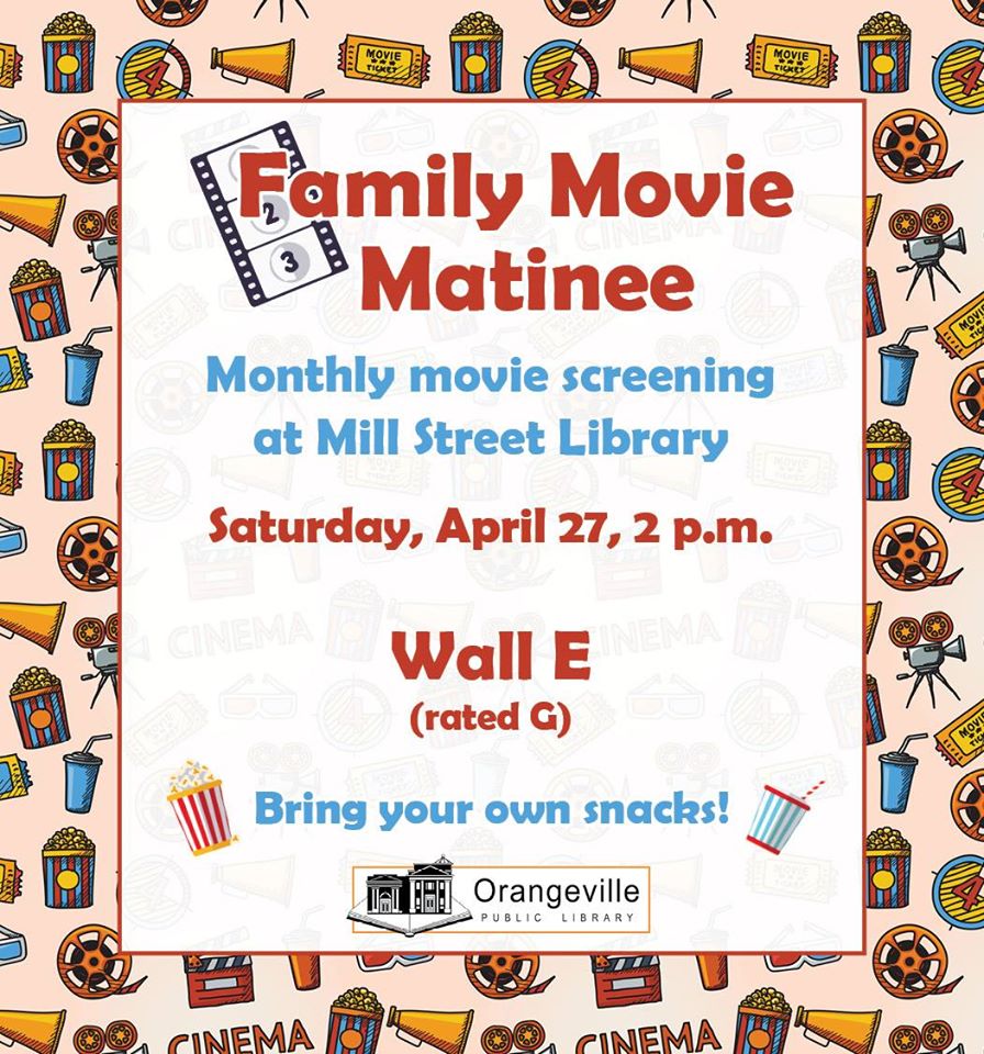 Saturday afternoon gather the kids and some snacks and head to the Orangeville Library on Mill Street at 2:00 pm, for a Saturday Movie Matinee. They will be showing Wall-E, check out the Facebook event page for more details.