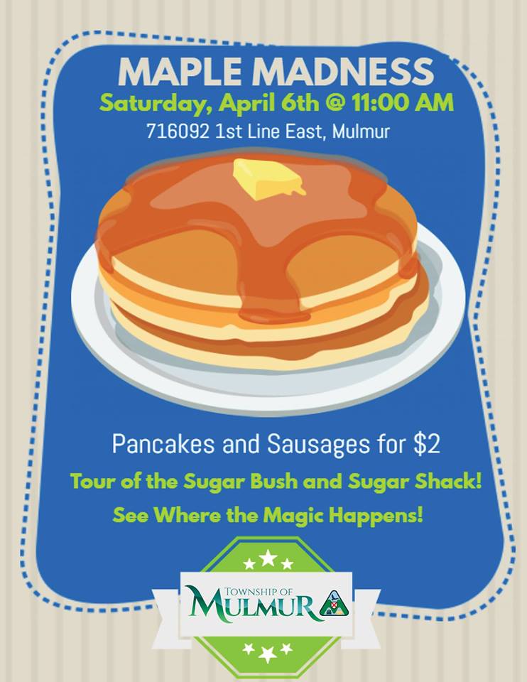 Mulmur Maple Madness is on Saturday from 11:00 am – 1:00 pm. Come out for pancakes, sausages and Maple Syrup. You will be able to tour the sugar bush and purchase maple products from 4M Maple Company. Go to the Facebook event page for location and more details.