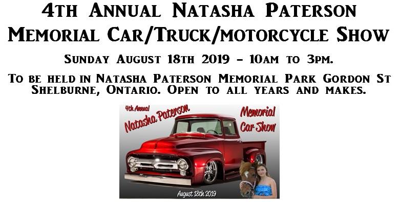 Sunday is the 4th Annual Natasha Paterson Memorial Car Show in Shelburne at the Natasha Paterson Memorial Park on Gordon Street from 10:00 am – 3:00 pm. There will be classic cars, games and entertainment, come out and support this great cause. Go to the Facebook event page for more information.