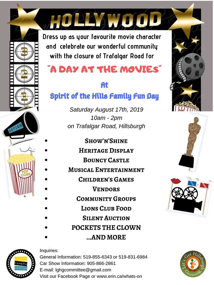 Saturday from 10:00 am – 2:00 pm come to Hillsburgh where they will have Trafalgar Road closed to celebrate The Spirit of the Hills Family Fun Day. The theme for this event is a day at the movies so dress up as your favourite movie character and celebrate the community of Hillsburgh with some fun family events including bouncy castles, face painting, live music and some great vendors. For more information about the event go to erin.ca.