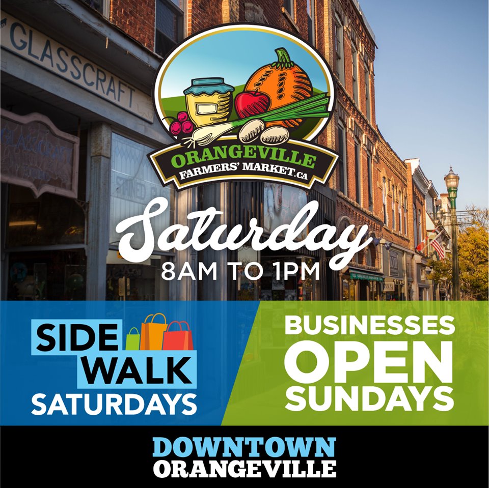 Downtown Orangeville on Saturday you can stop by the Orangeville Farmers Market and it’s Sidewalk Saturday. You can grab some great produce and other items at the market then walk Broadway and check out all the wonderful shops in downtown Orangeville. Go to Orangeville Famers Market Facebook page for more information about the Market and Downtown Orangeville Facebook page for more information about Downtown Orangeville.