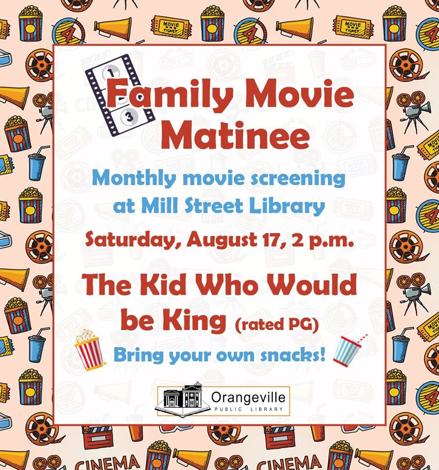 Saturday is a Family Movie Matinee at 2:00 pm at the Orangeville Public Library on Mill Street. Bring some snacks and come see the screening of The Kid Who Would Be King an updated telling of the story of King Arthur at the Library. Go to orangeville.ca for more information about this event.