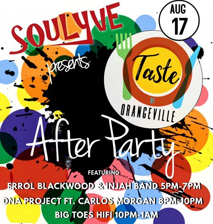 The Taste of Orangeville After Party will be hosted by Soulyve Catering and will offer a cash bar and power patties, as well as great music all night under the tent. This event will start at 5:00 pm and run until 1:00 am, there will be a $5 cover charge for this event. Check out Soulyve Catering & Events Facebook page for more details.
