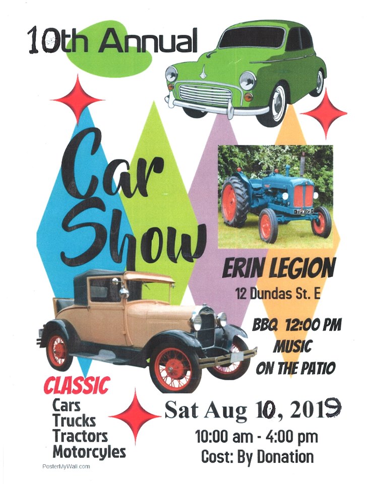 Saturday from 10:00 am – 4:00 pm stop by the Erin Legion for a Classic Car Show. There will be classic cars, trucks and tractors for you to see, and BBQ for you to enjoy. Go to the Facebook event page for more details about the show.