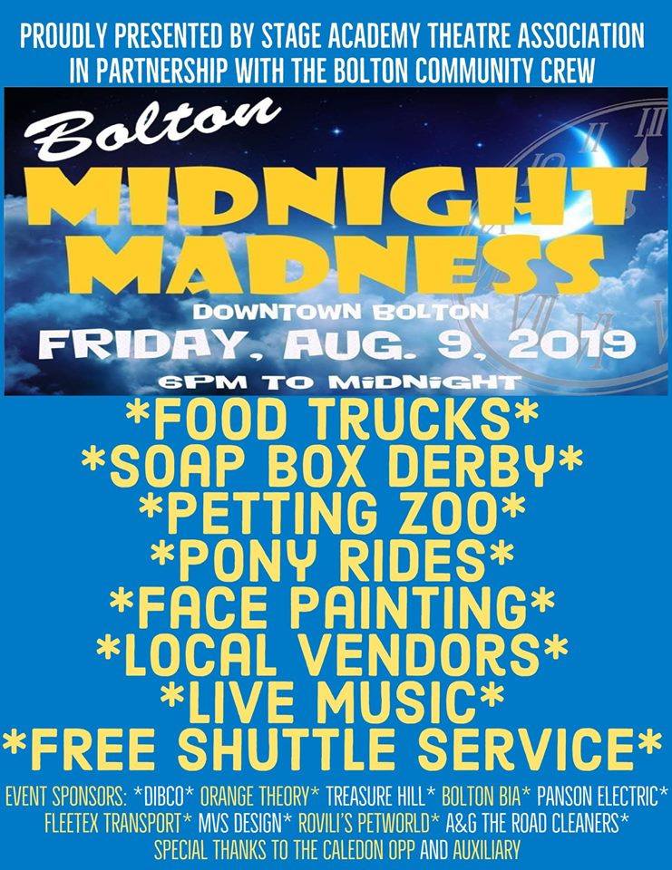 Friday night join the Bolton Community Crew for Bolton Midnight Madness. Head to Bolton from 6:00 pm – Midnight and enjoy family entertainment, music and great food in the downtown or head to the fairgrounds for the car show. Go to the Bolton Community Crew Facebook page for more information about what is going on.