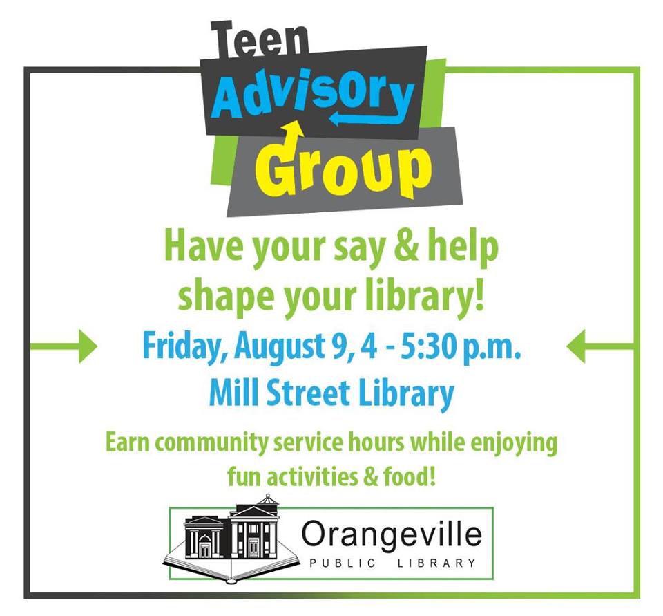 The Teen Advisory Group will meet on Friday from 4:00 – 5:30 pm at the Orangeville Public Library on Mill Street. You can meet with other teens in the community and help plan some child and youth programing that will be available in our community while earning your community service hours. Go to the Facebook event page for more details.