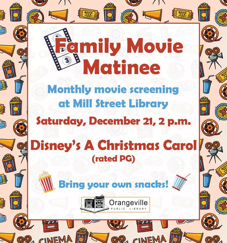 The Orangeville Public Library will be hosting a Family Movie Matinee this Saturday at 2:00 pm. They will be showing Disney’s: A Christmas Carol so bring the whole family and some snacks and enjoy the show. Go to www.orangeville.ca/orangeville-public-library for more details.