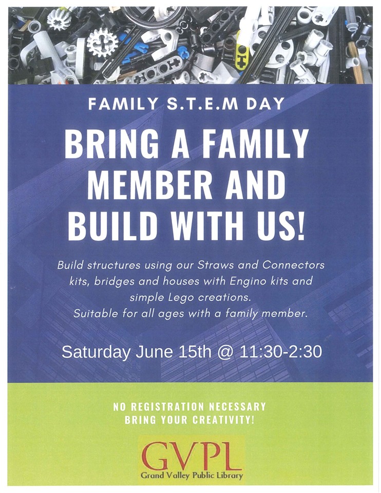 Saturday the Grand Valley Public Library will be hosting a Family S.T.E.M Building Day from 11:30 am – 2:30 pm. Stop by with your kids to build and create with a variety of different kits and building materials and robotics. Check out the Facebook event page.