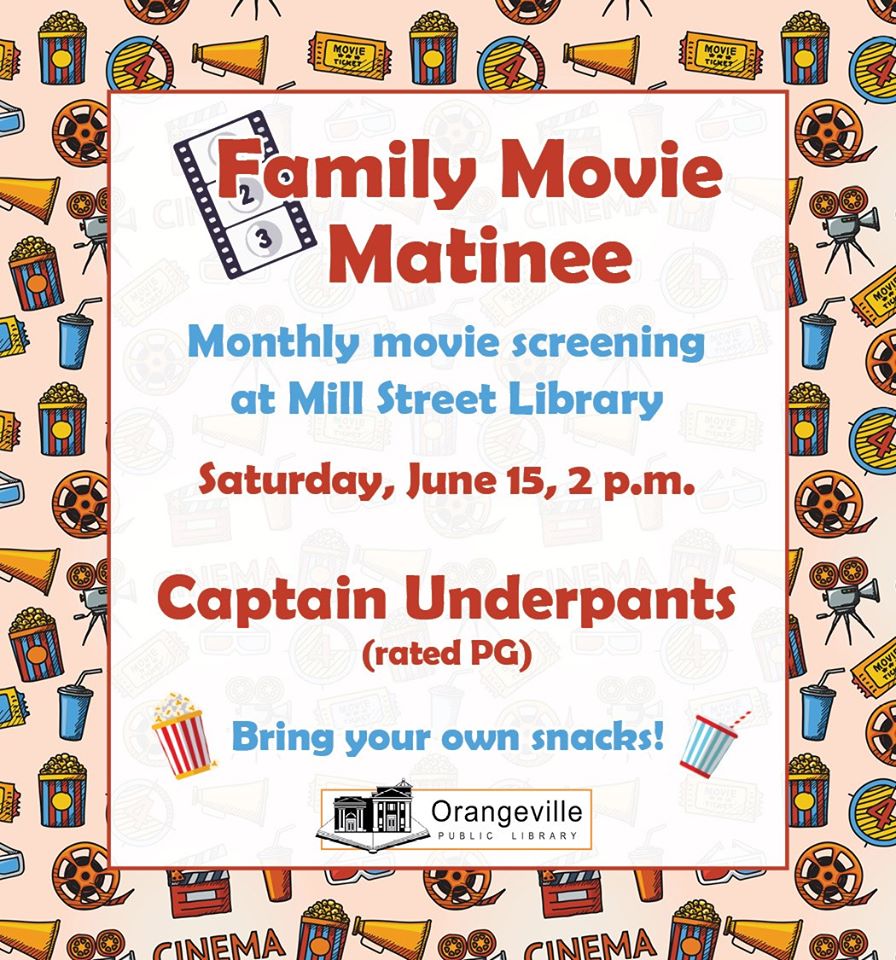 If we end up getting the rain that is in the forecast on Saturday, you can head over the Orangeville Public Library on Mill Street for the Family Movie Matinee. Bring your snacks and whole family for a screening of Captain Underpants. The Movie starts at 2:00 pm go to the Facebook event page for more details.