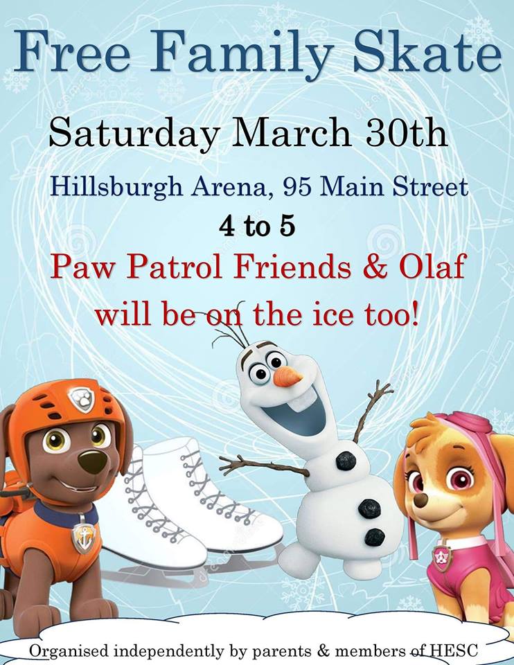 If you’re in the Hillsburgh area there is a Free Family Skate at the Hillsburgh Arena on Saturday from 4:00 – 5:00 pm. Bring the kids out and they can skate with Zuma and Skye from the Paw Patrol and Olaf from Frozen. Go to the Facebook event page for more details.