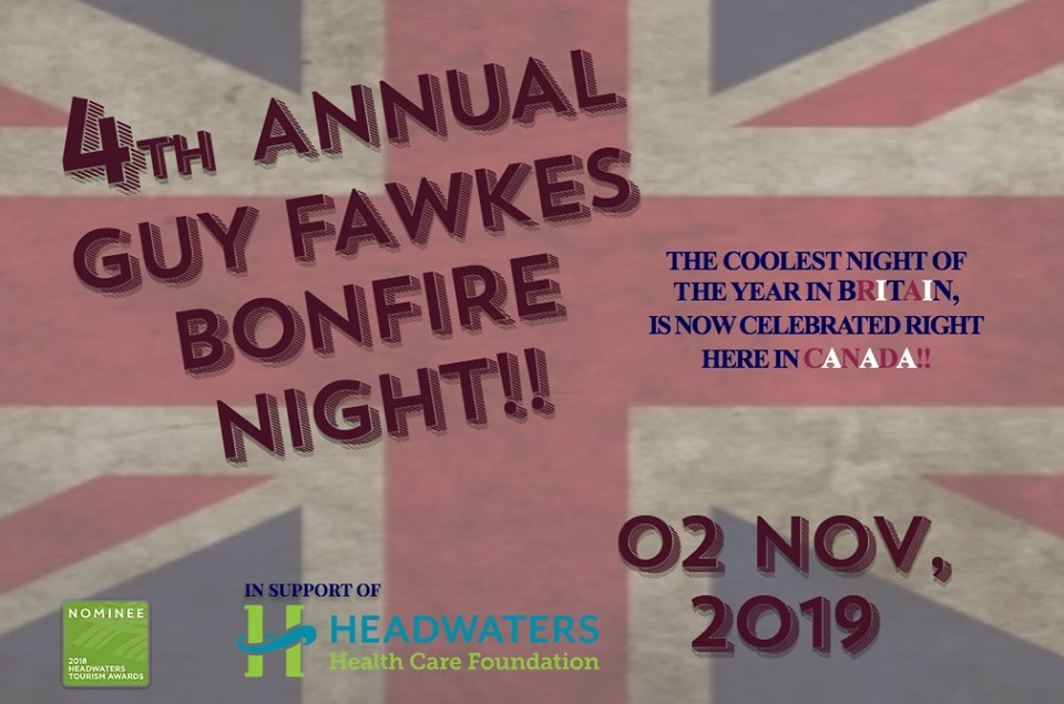 The 4th Annual Guy Fawkes Bonfire will be held at the Orangeville Fairgrounds on Saturday from 4:00 – 8:00 pm. Bring the whole family and take part in this British tradition in our own community and celebrate with great food, live music activities for the whole family to enjoy, a bonfire and fireworks to close out the event. Go to guyfawkes.ca for more information and to buy your tickets go to dufferin.snapd.com. Funds raised will go to support the Headwaters Health Care Foundation.