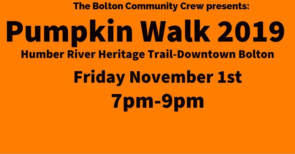 Friday Night in join the Bolton Community Crew for the Pumpkin Walk 2019, from 7:00 – 9:00 pm. You can take a walk along the Humber River Heritage Trail where you can admire hundreds of jack o lanterns that will light your way. Admission is free but they will be accepting donation of a non perishable food item for the eXchange. For more information go to the Facebook event page.