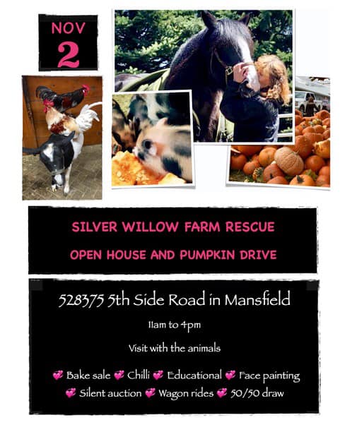 Saturday join Silver Willow Farm Rescue and Sanctuary for their annual Pumpkin and Food Drive Open House from 11:00 am – 4:00 pm at the farm in Mansfield. Bring your carved pumpkins, gourds, and any other animal feed for the animals and take part in a fun day at the farm where you can meet the animals, enjoy a horse drawn wagon ride, find some treats at the bake sale, face painting for kids and more. Go to silverwillowfarmrescue.com to learn more about the farm.
