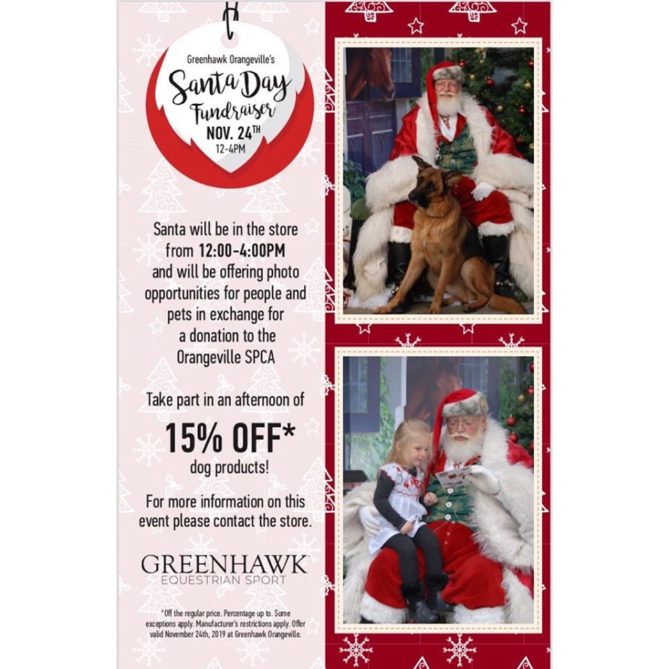 If you are looking to have your picture taken with Santa this year go to Santa Day at Greenhawk Orangeville on Sunday from 12:00 – 4:00 pm. They will be collecting monetary donations for the Orangeville SPCA in exchange for you or your pet (or both of you) having your picture with Santa. Go to the Greenhawk Orangeville Facebook page for more information.