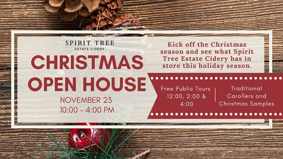 Saturday, Spirit Tree Estate Cidery will be hosting a Christmas Open House from 10:00 am – 4:00 pm. Come out and enjoy a tour of the facilities, Christmas carols sung by the Orange Peel Carollers, and sample some of Spirt Trees baked goods. The Spirit Tree Bistro will be launching its new winter menu starting at the open house. For more details go to spirittreecider.com.