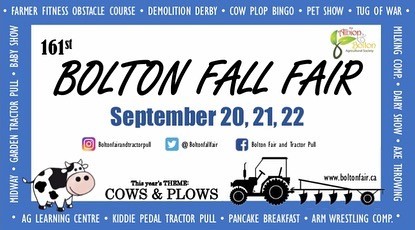 The Bolton Fall Fair will be held at the Albion Hills Fairgrounds Friday through Sunday. With the theme of Cows and Plows be sure to stop by and enjoy some of the fun a this years fair. Go to boltontractorpull.ca for a list of all the events going on this weekend.