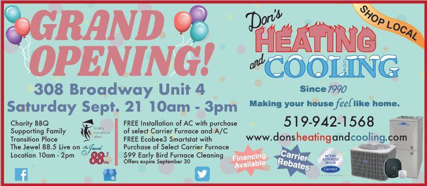 Join Don’s Heating and Cooling for the Grand Opening of their new showroom at 308 Broadway on Saturday from 10:00 am – 3:00 pm. Stop by for some deals and giveaways and there will be a charity BBQ in support of Family Transition Place. For more information go to donsheatingandcooling.com.