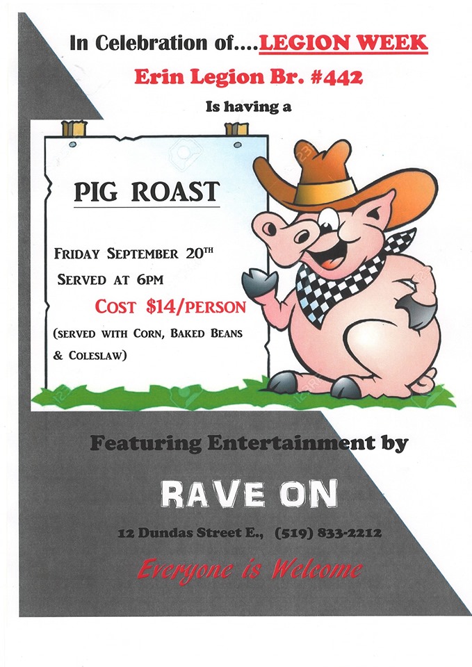 In celebration of Legion Week the Erin Legion will be hosting a Pig Roast on Friday evening from 6:00 – 8:00 pm for a delicious meal and some live entertainment. Go the Facebook event page for more information.