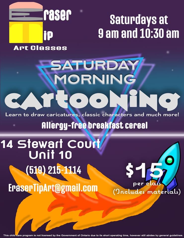 If your kids are into drawing and art Eraser Tip Art Classes is hosting Saturday Morning Cartoons from 9:00 – 10:30 am on Saturdays at their location on Stewart Court. You kids will learn different drawing styles and meet some like minded budding artists. Go to the Eraser Tip Art Classes Facebook page for more information about these classes.