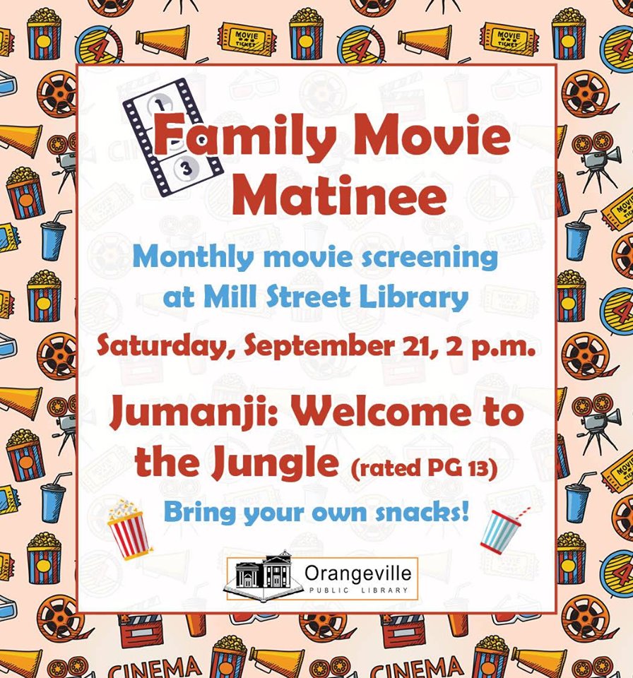 Saturday join the Orangeville Public Library on Mill Street for a Family Movie Matinee screening of Jumangi: Welcome to the Jungle at 2:00 pm. Be sure the bring some snacks and enjoy this family film with the whole family. Go to the Facebook event page for more details.
